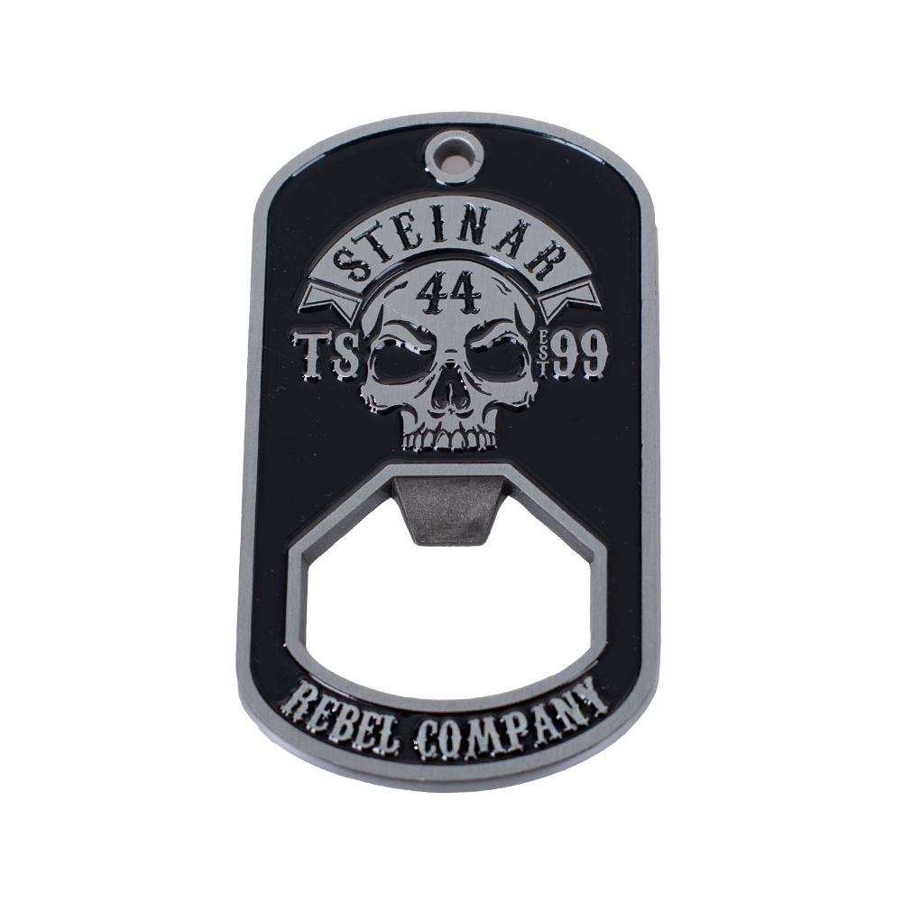 Hochwertig geprägter Schlüsselanhänger aus Metall (Zinn) mit Flaschenöffner, nickelfrei;