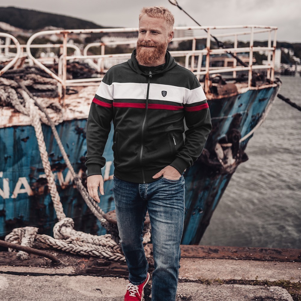 Plakative, klassische Kapuzenjacke mit großem Wikingermotiv. Angesetzte Belege an den Taschen und der Kapuze; gesticktes Logo auf der Brust; verdeckter Reißverschluss; Rückenmotiv bestehend aus hochwertigem Druck. Material: 70% Baumwolle, 30% Polyester