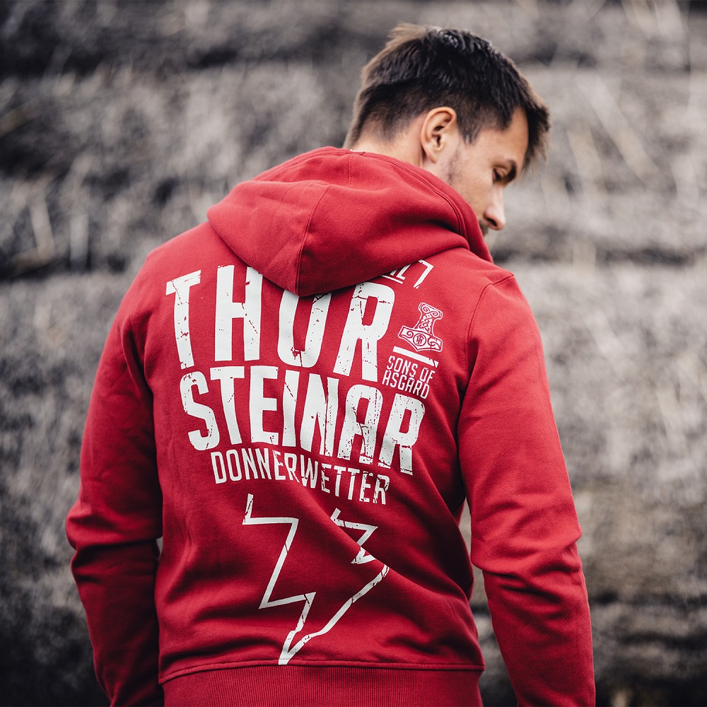 Striking, classic hooded jacket with a large Viking motif. Attached inserts on the pockets and hood; embroidered logo on the chest; concealed zip; back motif consisting of a high-quality print. Material: 70% cotton, 30% polyester